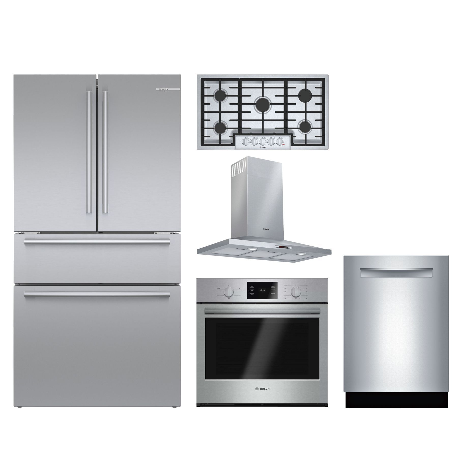 Bosch 5 Piece Stainless Steel Kitchen Package with a french door refrigerator, range hood, built in dishwasher, gas cooktop, and single wall ovenRead More