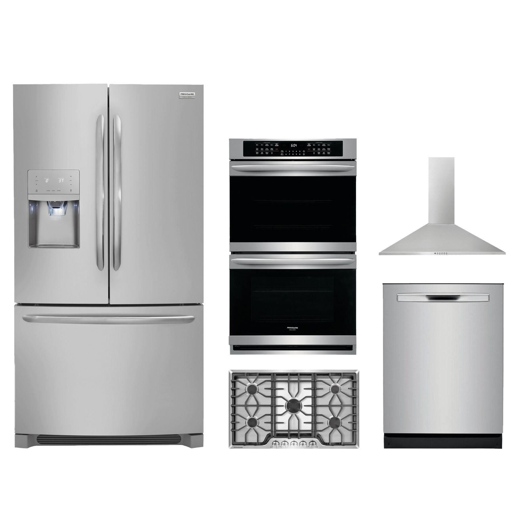 Frigidaire Gallery® 5 Piece Stainless Steel Kitchen Package with a french door refrigerator, gas cooktop, double wall oven, built in dishwasher, and range hoodRead More