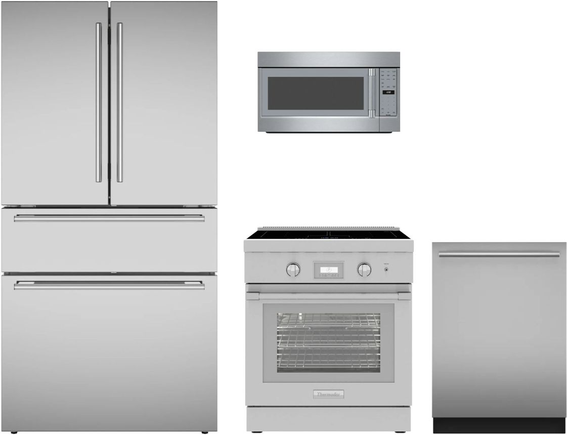 Thermador® 4 Piece Stainless Steel Kitchen Package with a French door refrigerator, freestanding induction range, over the range microwave, and built in dishwasher.Read More